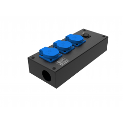 Коробка розеточная серии КРА из алюминиевого профиля на 3 розетки Schuko с крышкой. Два отверстия Ø 37 мм под трубу или гермоввод PG29. Габариты: 215х115х85 мм. Вес 0,95 кг.