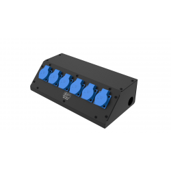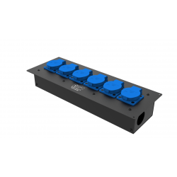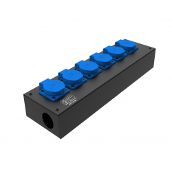 6 розеток Schuko 16А. Два отверстия Ø37 мм под трубу. Габариты: 404x202x110 мм.