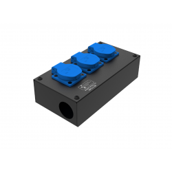 Коробка розеточная серии КРА из алюминиевого профиля на 3 розетки Schuko с крышкой. Два отверстия Ø 37 мм под трубу или гермоввод PG29. Габариты: 215х115х85 мм. Вес 0,95 кг.