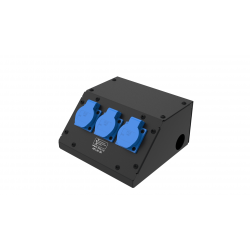Коробка розеточная ТТС серии KPC-C стальная скошенная, 3 розетки Schuko 16А. Два отверстия Ø37 мм под трубу. Габариты: 218х114х206 мм.