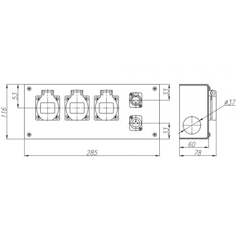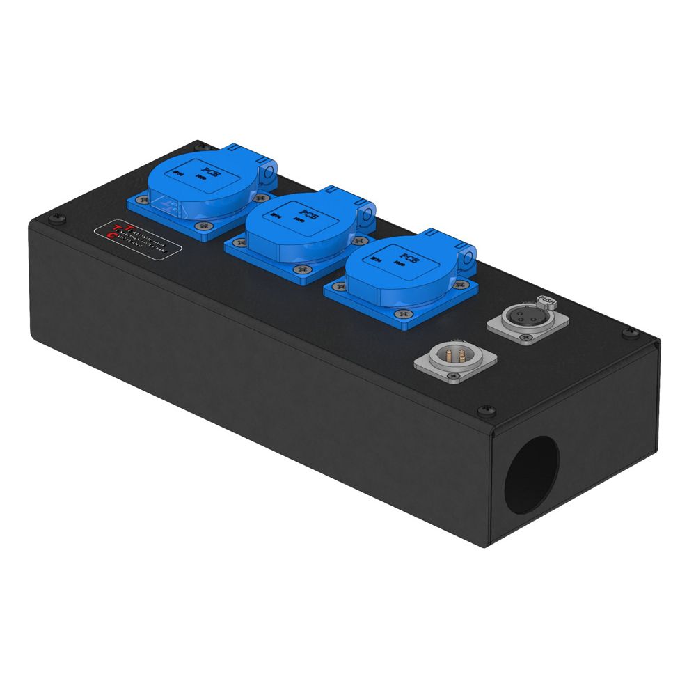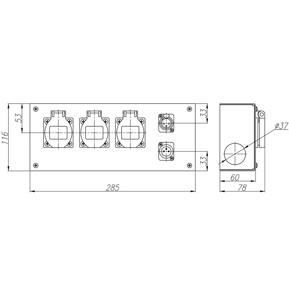 Коробка розеточная ТТС серии КРC стальная прямая. 3 розетки Schuko 16А, 2 разъема XLR 5-pin: female и male. Два отверстия Ø37 мм под трубу. Габариты: 285х116х78 мм.