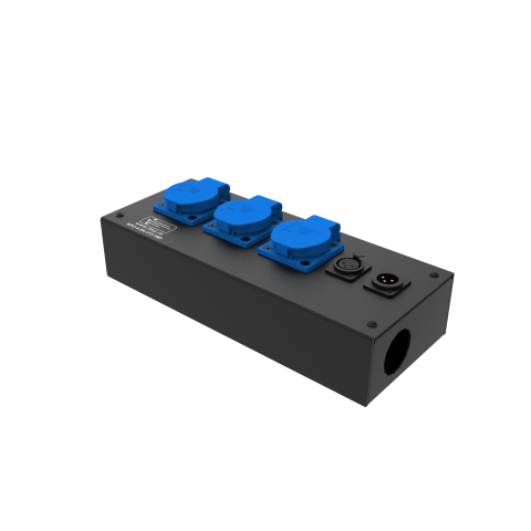Коробка розеточная ТТС серии КРC стальная прямая. 3 розетки Schuko 16А, 2 разъема XLR 3-pin: female и male. Два отверстия Ø37 мм под трубу. Габариты: 285х116х77 мм.