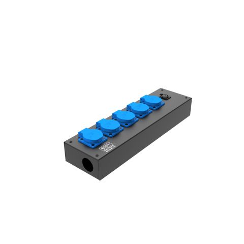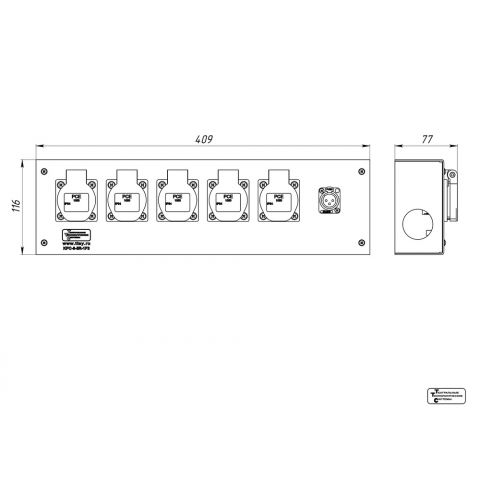 Коробка розеточная ТТС серии KPC стальная прямая. 5 розеток Schuko 16А, 1 разъем XLR 3-pin female. Два отверстия Ø37 мм под трубу. Габариты: 409х116х78 мм.