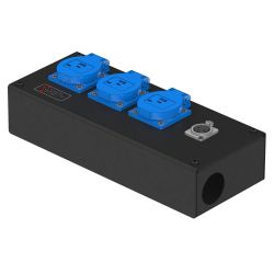 Коробка розеточная ТТС серии KPC стальная прямая. 3 розетки Schuko 16А, 1 разъем XLR 5-pin female. Два отверстия Ø37 мм под трубу. Габариты: 285х116х78 мм.