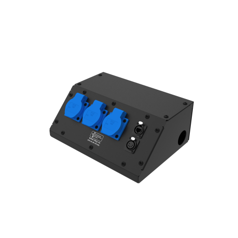 Коробка розеточная ТТС серии KPC-C стальная скошенная, 3 розетки Schuko 16А, 1 разъем XLR 5-pin female, 1 разъем RJ-45. Два отверстия Ø37 мм под трубу. Габариты: 281х114х206 мм.