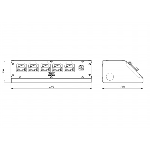 Коробка розеточная ТТС серии KPC-C стальная скошенная, 5 розеток Schuko 16А, 1 разъем XLR 5-pin female. Два отверстия Ø37 мм под трубу. Габариты: 405х114х206 мм.