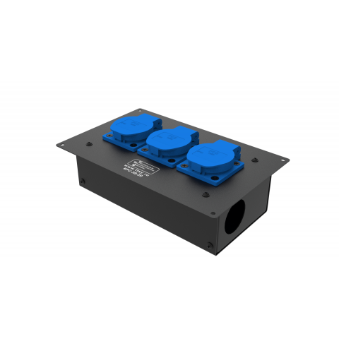 Коробка розеточная ТТС серии KPC-В стальная встраиваемая, 3 розетки Schuko 16А. Два отверстия Ø37 мм под трубу. Габариты: 220х140х78 мм.