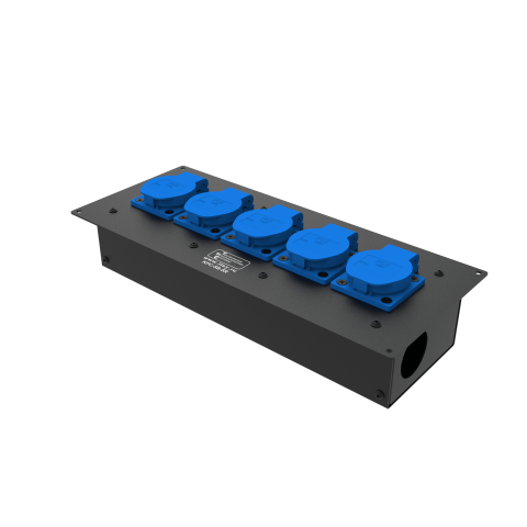 Коробка розеточная ТТС серии KPC-В стальная встраиваемая, 5 розеток Schuko 16А. Два отверстия Ø37 мм под трубу. Габариты: 330x140x78 мм.