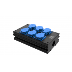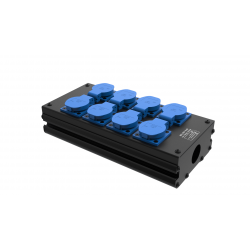 Коробка розеточная серии КРА из алюминиевого профиля на 8 розеток Schuko (2х4 шт.), расположенных в 2 ряда. Два отверстия Ø37 мм под трубу или гермоввод PG29. Габариты: 265х152х78 мм. Вес 1,5 кг.