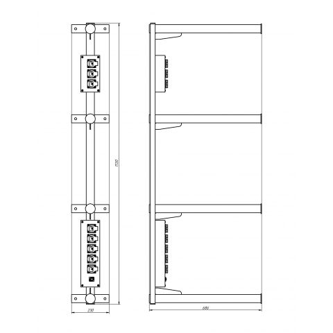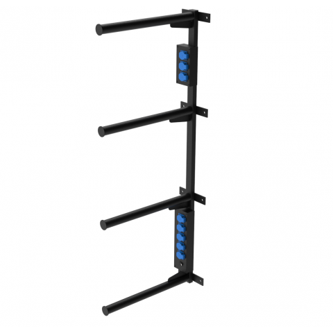 Кронштейн световой I-образный (боковой) для установки 8-и световых приборов. Средняя консоль. С розеточными коробками KPC-6-5R-1F3 (5 розеток Schuko и 1 разъем XLR 3 pin female) и KPC-3-3R (3 розетки Schuko) . Защита от соскальзывания прибора. Сталь. Окраска черная (по заказу любая по RAL) порошковая. Высота L=1720 мм, четыре консоли диам. 50 мм, длина 650 мм., шаг между консолями 550 мм. Нагрузка на одну консоль до 50 кг. Общая нагрузка на кронштейн не более 150 кг. Вес не более 24 кг.