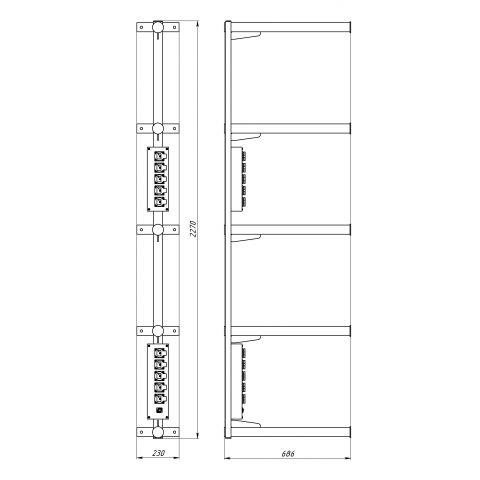Кронштейн световой I-образный (боковой) для установки 10-и световых приборов. Средняя консоль. С розеточными коробками KPC-6-5R-1F3 (5 розеток Schuko и 1 разъем XLR 3 pin female) и KPC-5-5R (5 розеток Schuko). Защита от соскальзывания прибора. Сталь. Окраска черная (по заказу любая по RAL) порошковая. Высота L=2270 мм, пять консолей диам. 50 мм, длина 650 мм., шаг между консолями 550 мм. Нагрузка на одну консоль до 50 кг. Общая нагрузка на кронштейн не более 200 кг. Вес не более 30 кг.